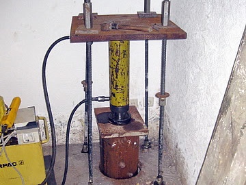 Um das zu erreichen, werden die Hydraulikzylinder im Keller auf sogenannte Hubstützen, an statisch zuvor berechneten Punkten, eingebaut. Durch 300 mm große Kernbohrungen werden die Hubstützen über eine Rückverankerung bis in die tragfähigen Bodenschichten eingepresst. Im Anschluss wird das gesamte Haus an den Hubstützen nach oben gezogen.